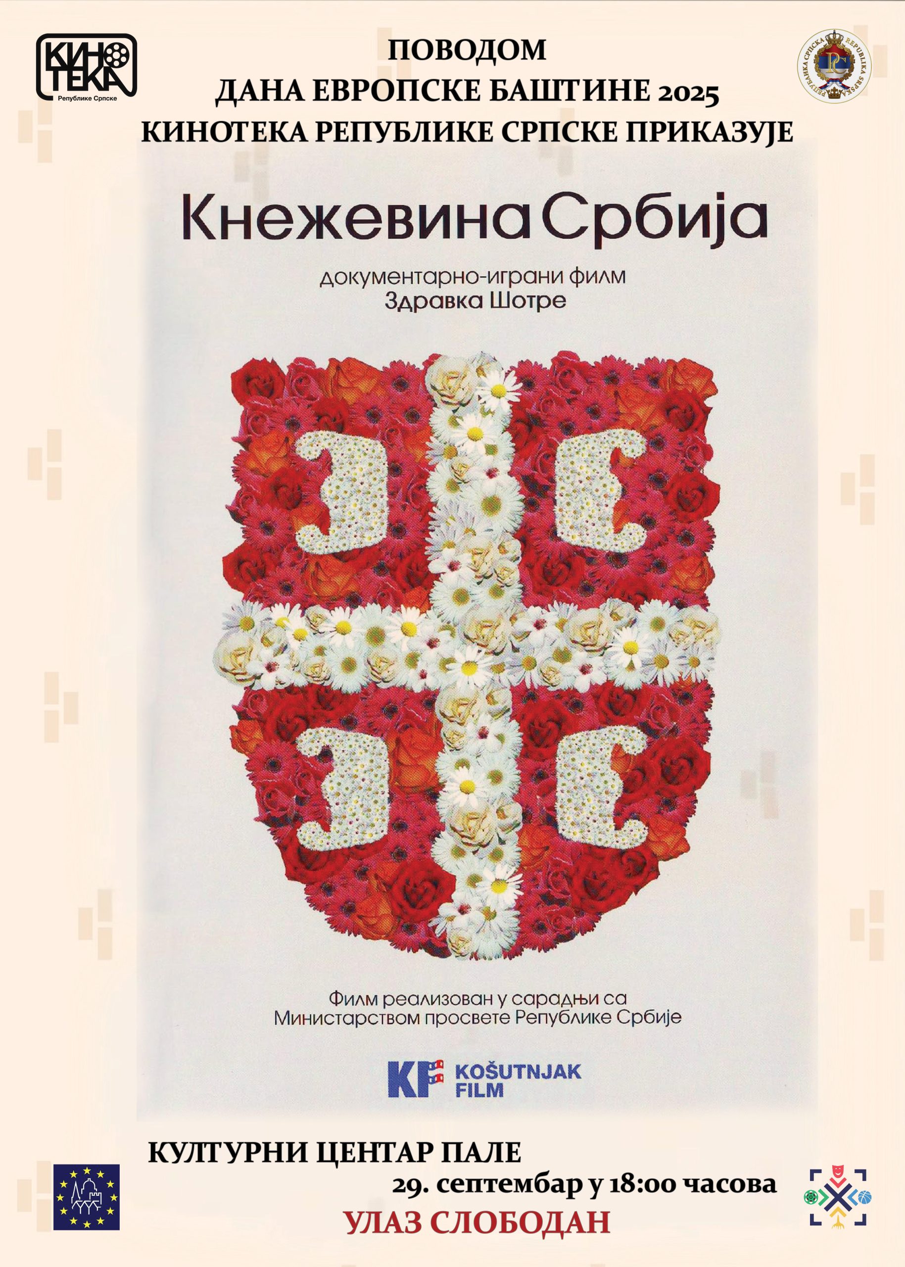 У оквиру програма „Дани европске баштине“ Кинотека Републике Српске 29. септембра у 18:00 часова ће приказати документарно-играни филм Здравка Шотре „Кнежевина Србија“. Први из триологије документарно- играног серијала Здравка Шотре филм описује период српске револуције, борбe српског народа за ослобођење