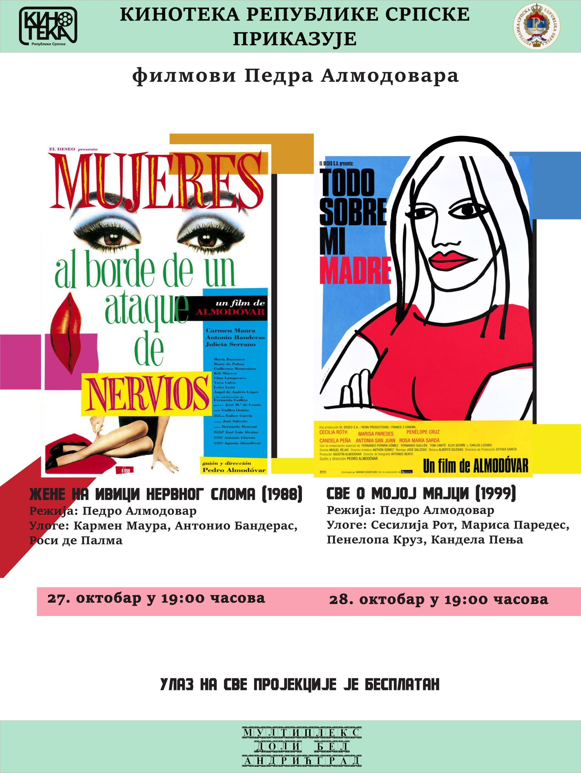 Овај мјесец Кинотека Републике Српске приказује филмове посвећене чувеном шпанском режисеру Педру Алмодовару. У понедељак 27. октобра у 19:00 часова на програму је филм „Жене на ивици нервног слома“ из 1988. године. Филм истражује тему женске емоционалне снаге и лудила у лицу