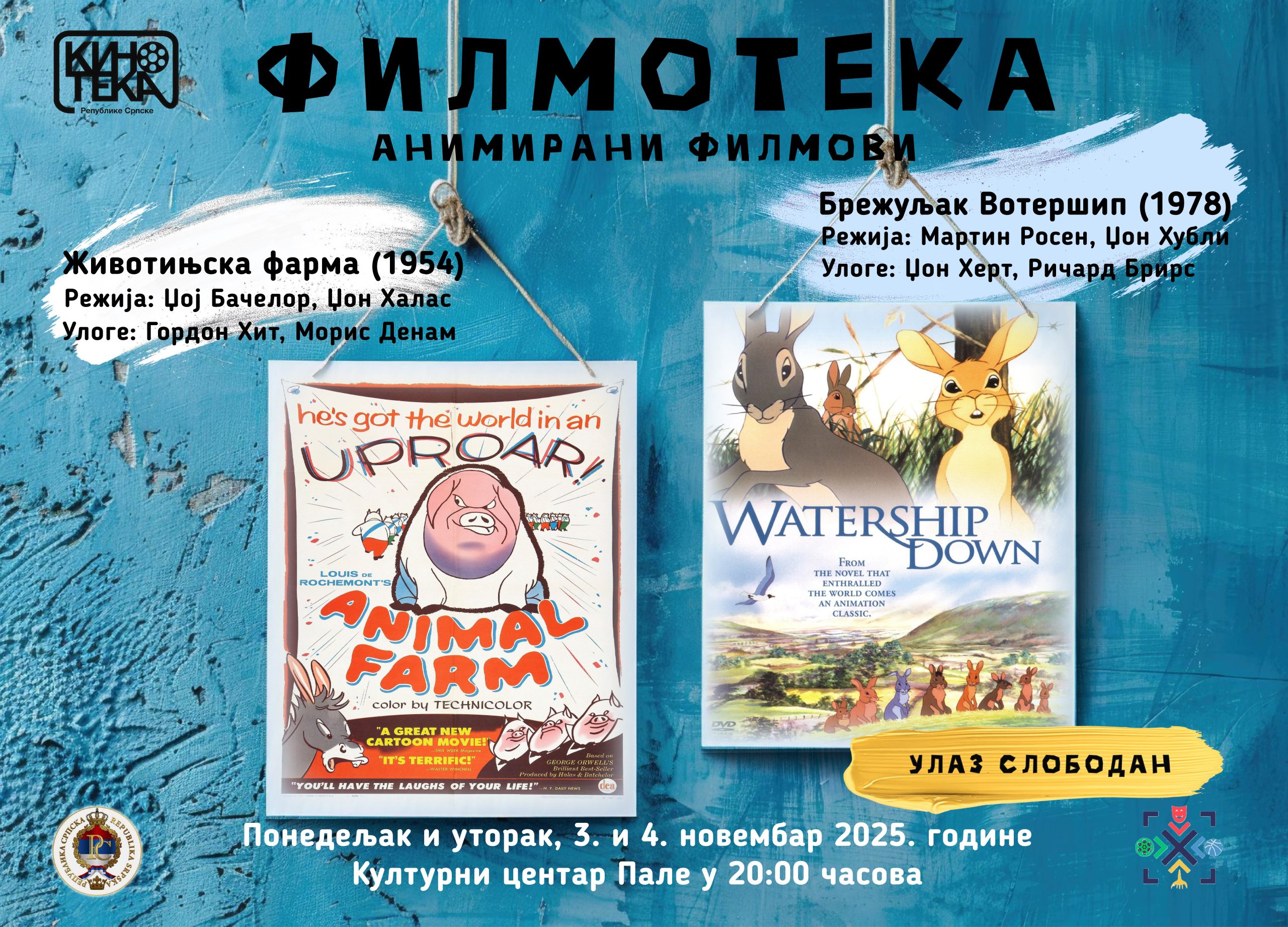 Новембарска Филмотека коју организује Кинотека Републике Српске у знаку је старих анимираних филмова. Прво вече у понедељак 3. новембра у 20:00 часова на програму је свјетски класик анимације „Животињска фарма“ (1954) по истоименом чувеном роману Џорџа Орвела. У овој историјској првој британској