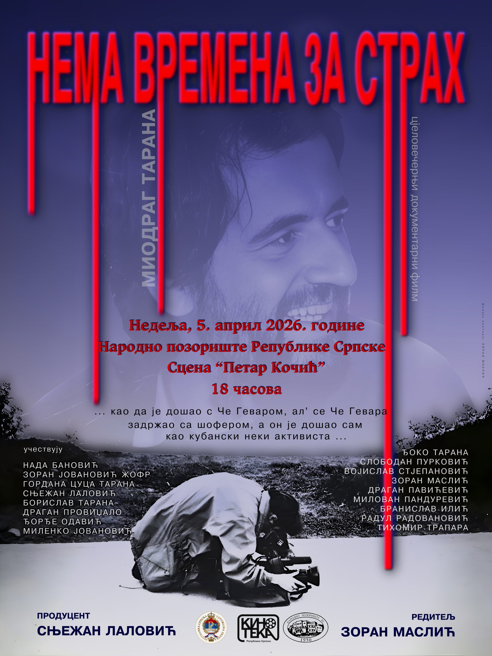 Кинотека Републике Српске у сарадњи са Народним позориштем Републике Српске организује пројекцију документарног филма „Нема времена за страх“ – о Миодрагу Тарани. Ово је драматична прича о једном од најталентованијих филмских и културних радника, оснивачу првог филмског предузећа Републике Српске „Срна филм“ и једном од најважнијих оснивача Радио-телевизије Републике Српске. Коаутор је првог филма Републике Срспке „Љето сам провео“ који је награђен на Мартовском фестивалу у Београду и на тај начин донио прво међународно признање Републици Српској на пољу културе.